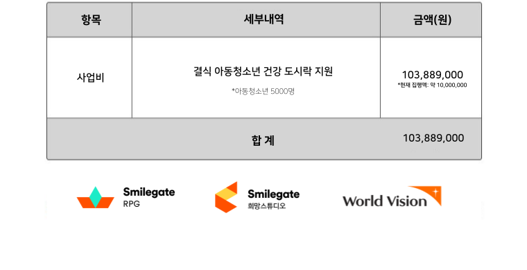 총 103,889,000원의 기부금이 조성되었으며, 해당 기부금 전액은 월드비전을 통해