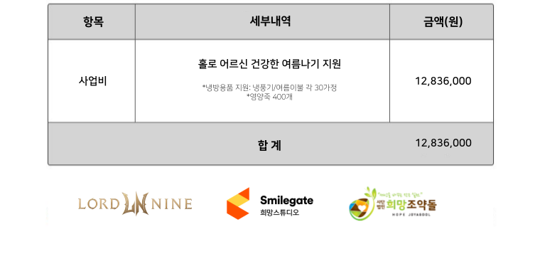 성남 지역 홀로 어르신 냉방용품 및 건강식(영양죽)으로 전액 지원되었습니다.