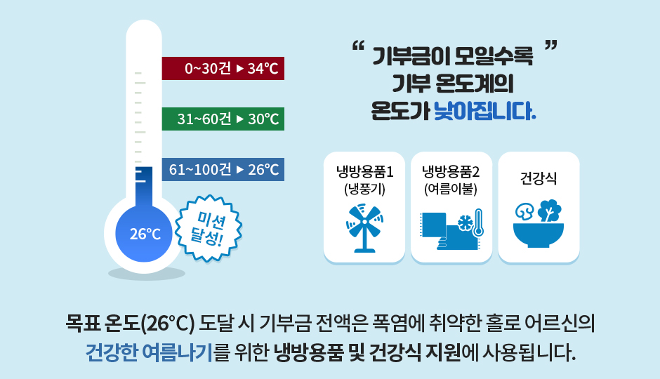 성남 지역 홀로 어르신 냉방용품 및 건강식(영양죽)으로 전액 지원되었습니다.